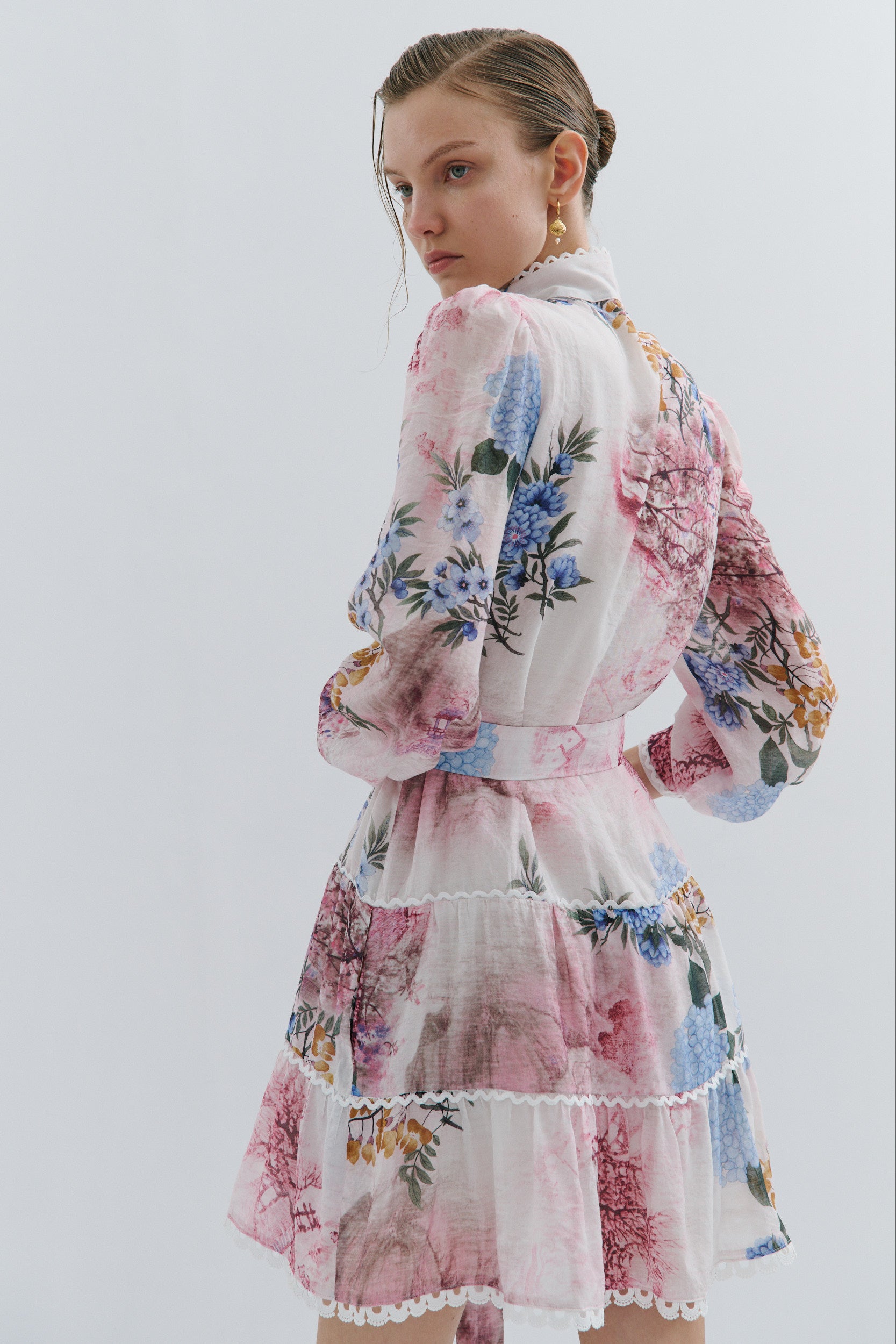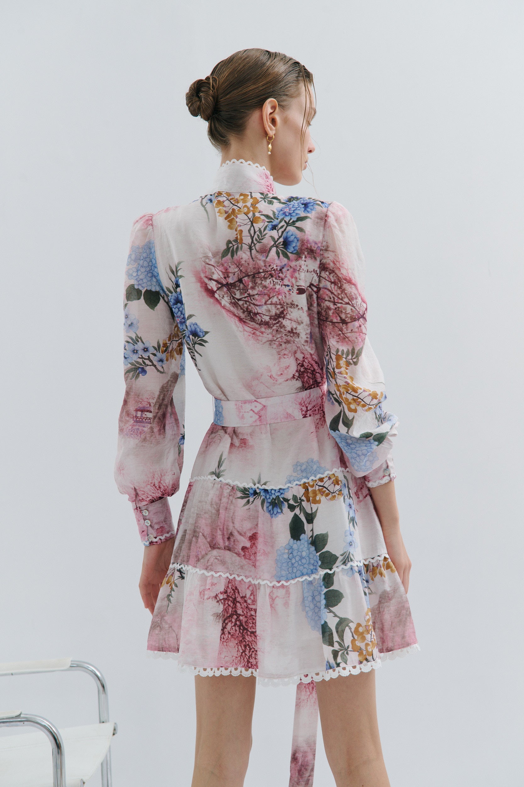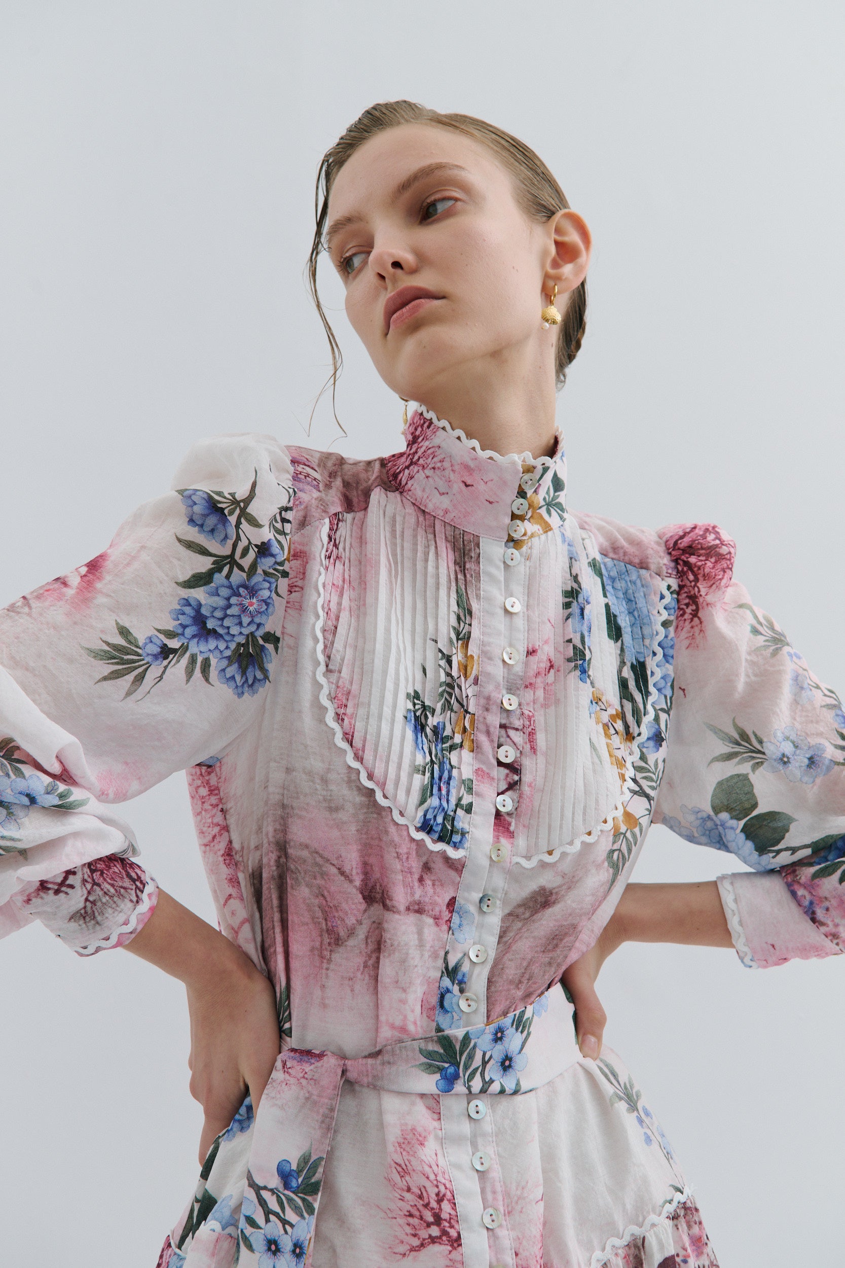 Blouson sleeves finished with a three-shell button cuff, also trimmed with lace for a romantic flair.