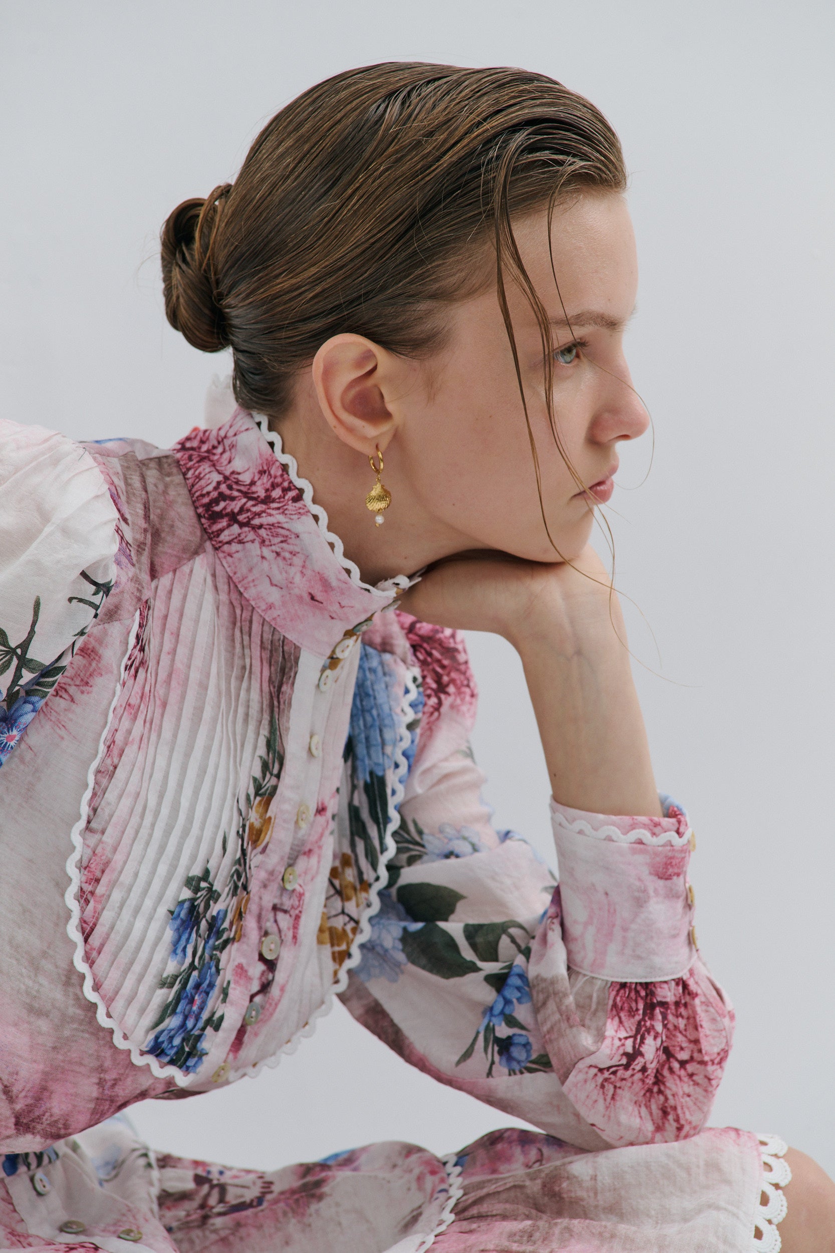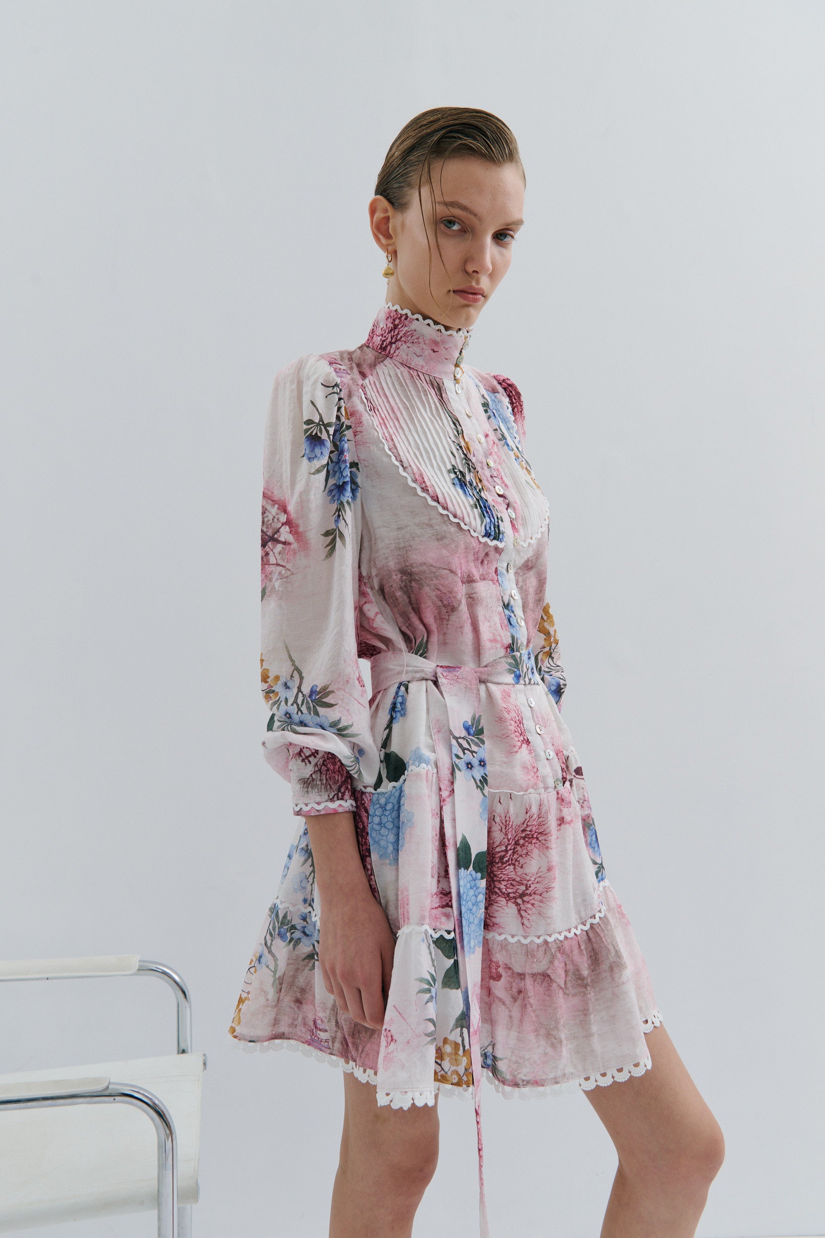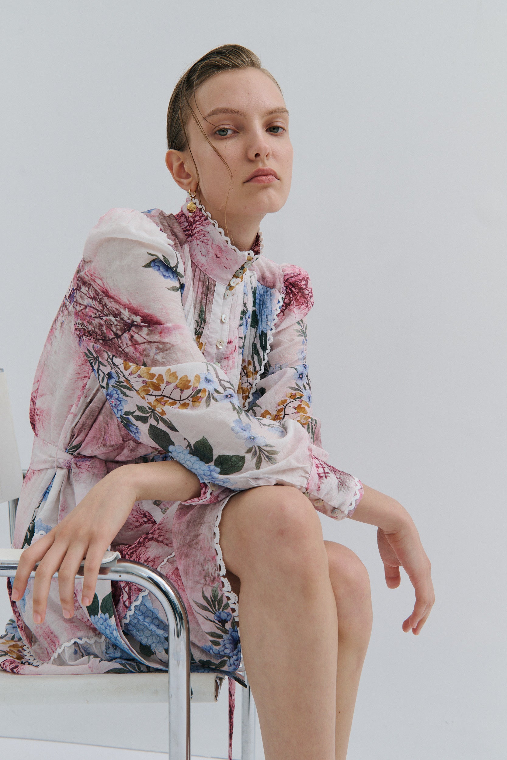 Blouson sleeves finished with a three-shell button cuff, also trimmed with lace for a romantic flair.