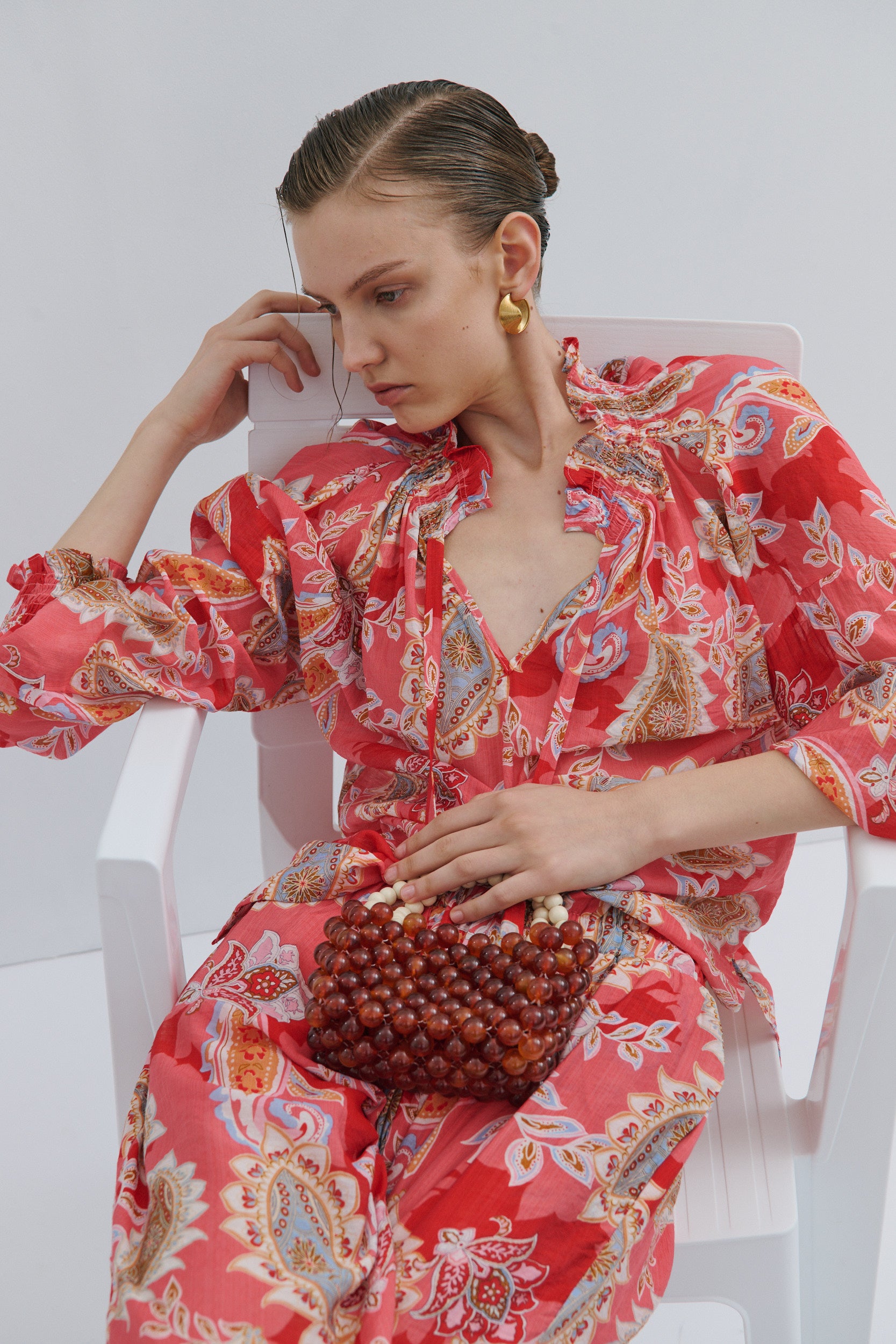Channel Anita Pallenberg with the option of a long V-neck opening, letting the light top flow effortlessly with matching pants, bringing a boho chic yet refined essence.