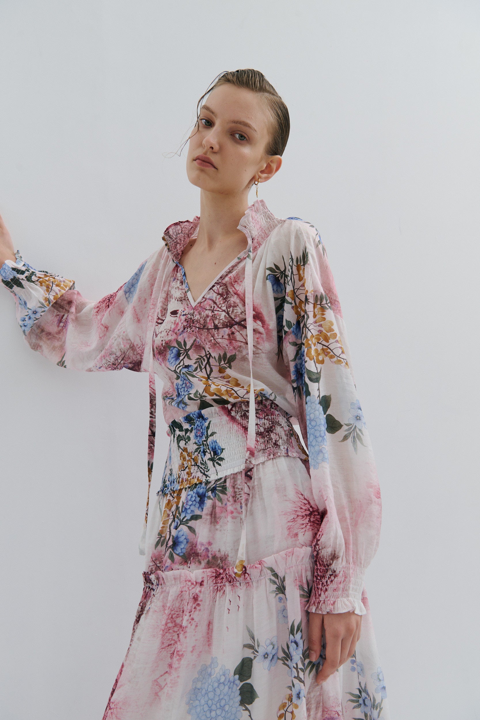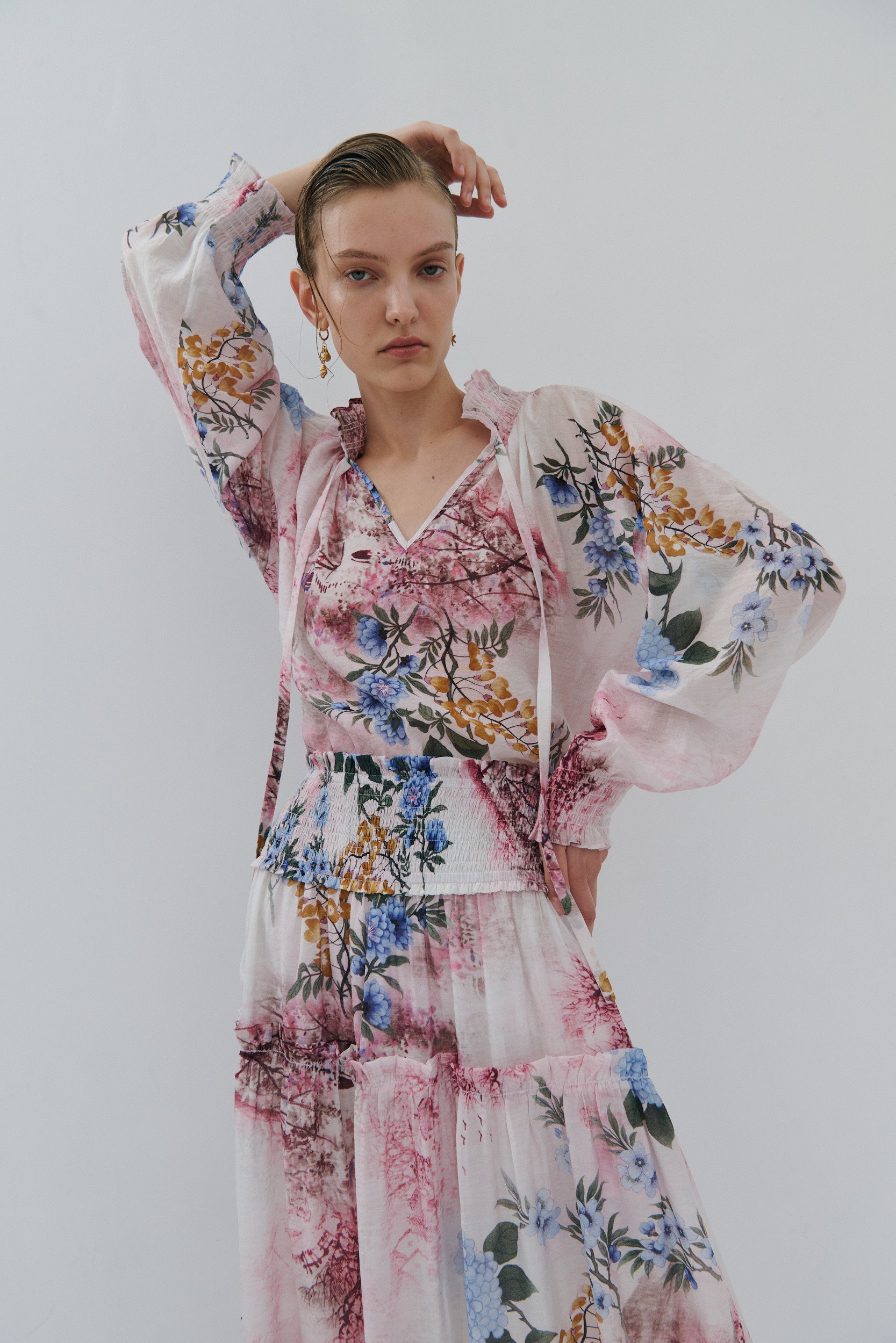 Features four rows of intricately sewn elastic shirring around the neck, creating an elegant and versatile silhouette: