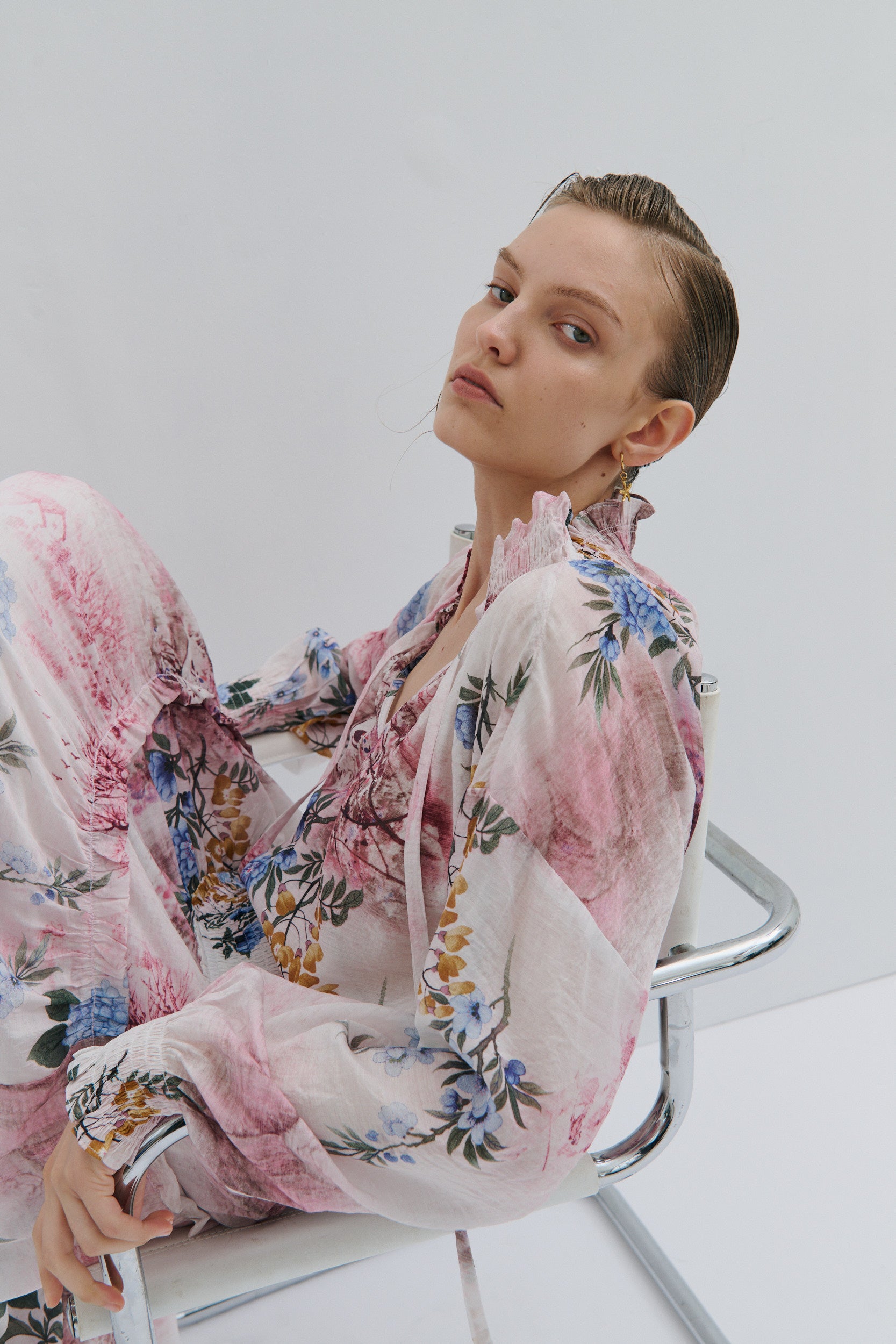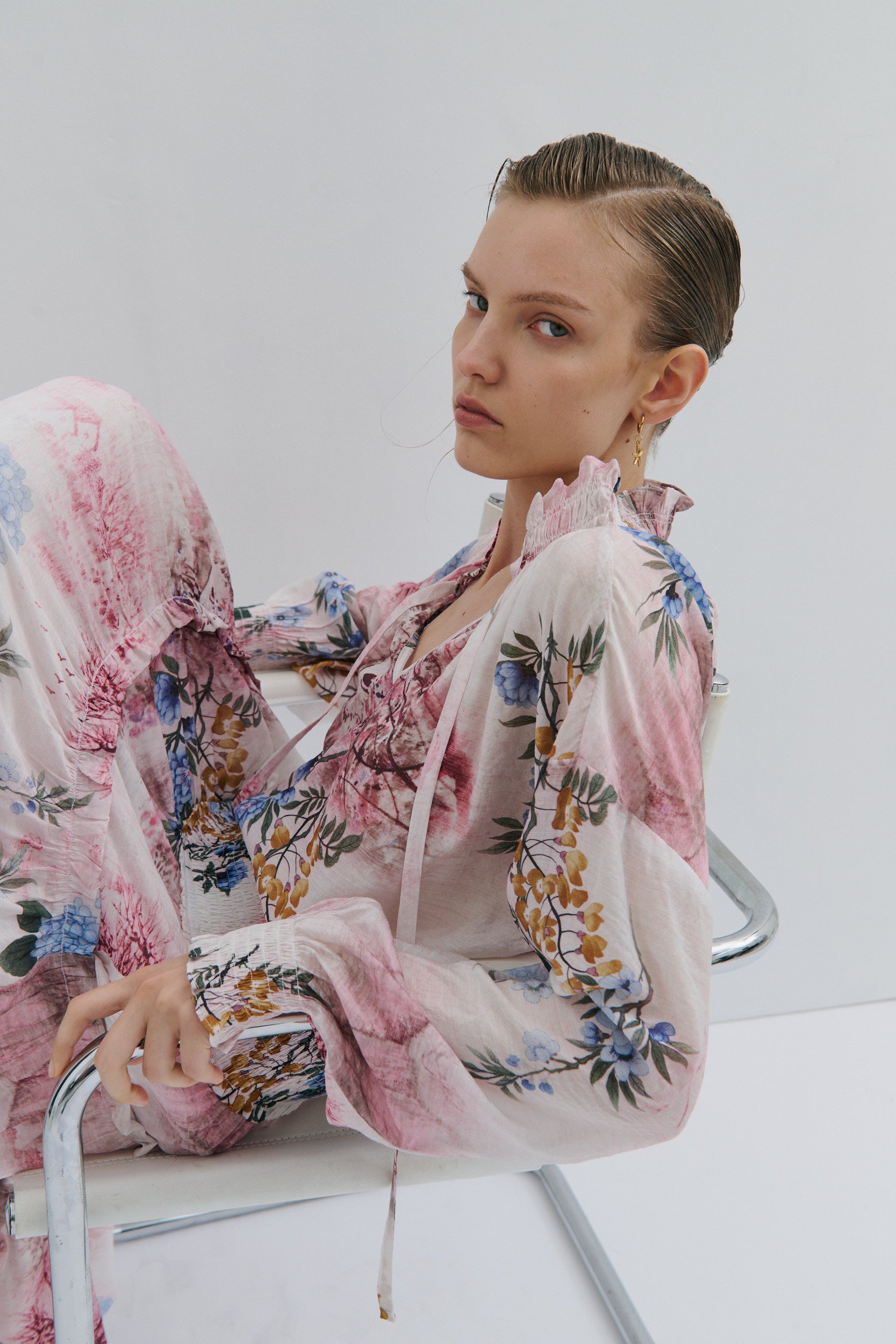 Shirred elastic cuffs, finished with delicate frills, add a touch of romance and versatility: